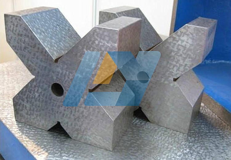 一般V型架都是一副兩塊,兩塊的平面與V型槽都是在一次安裝中磨出的。V型架的尺寸相互表面間的平行度,垂直度誤差在0.01毫米之內(nèi),V型槽的中心線在V型架的對(duì)稱平面內(nèi)并與底面平行,同心度,平行度的誤差也在0.01毫米之內(nèi),V型槽半角誤差在±30~±1范圍內(nèi)。V型架也可做劃線,帶有夾持弓架的V型架,可以把圓柱形工件牢固的夾持在V型架上,翻轉(zhuǎn)到各個(gè)位置劃線。